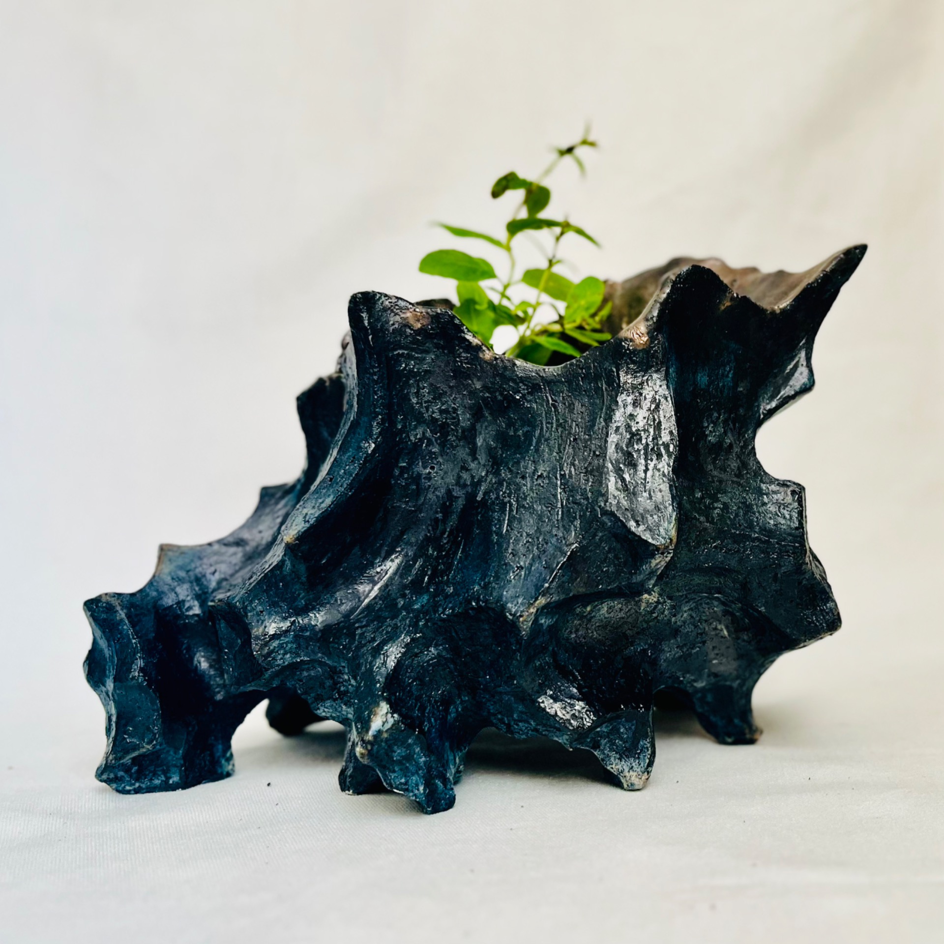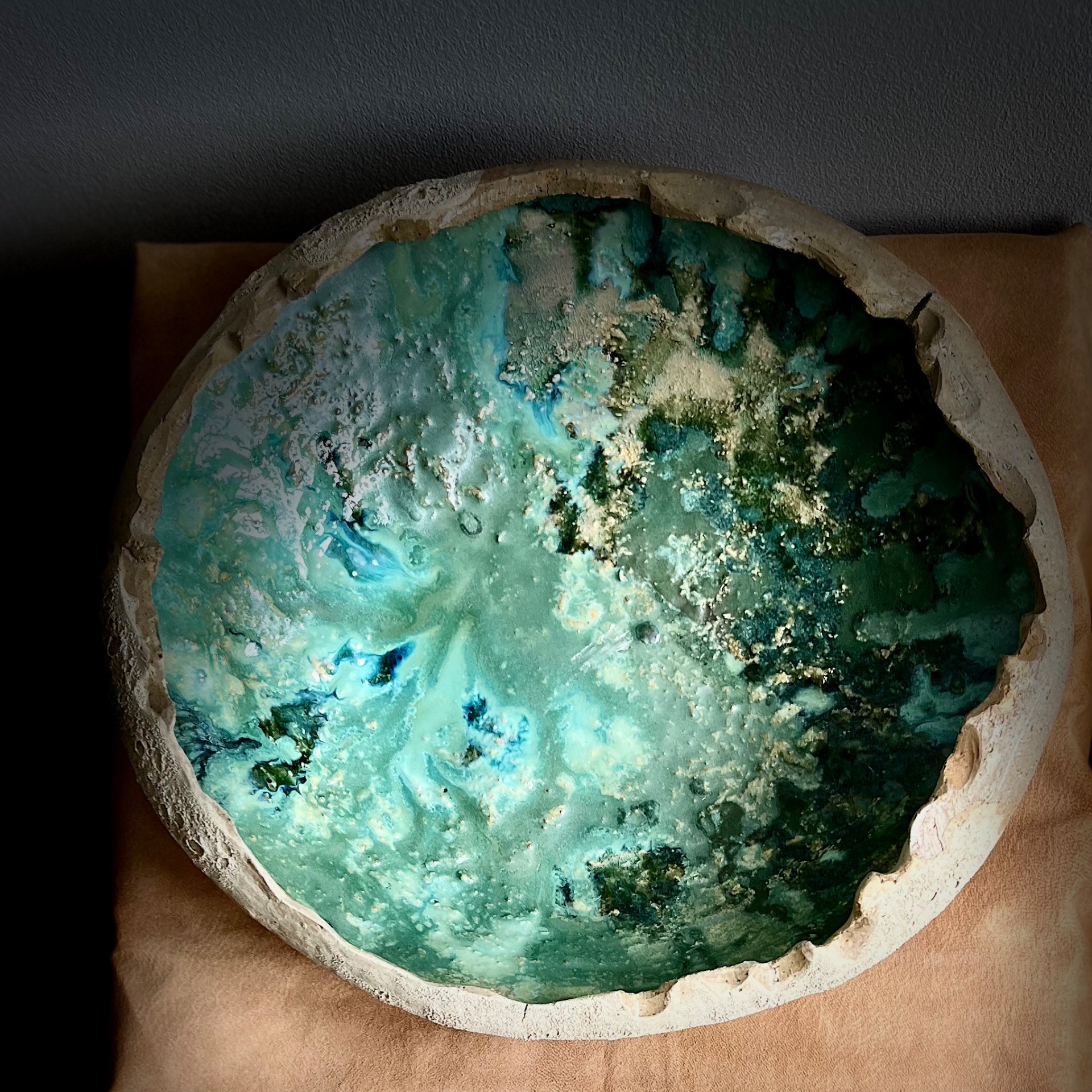MOON - keramikfade med et brutalt månelandskab på ydersiden. Indersiden præsenterer en smuk harmoni af mineralske grønne og blå nuancer, der skaber en iøjnefaldende kontrast til det ydre design.